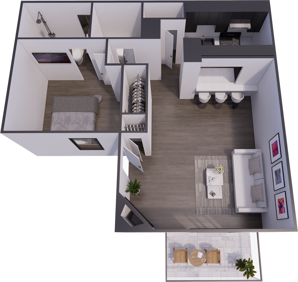 Spacious one bedroom layout with comfortable living and storage.