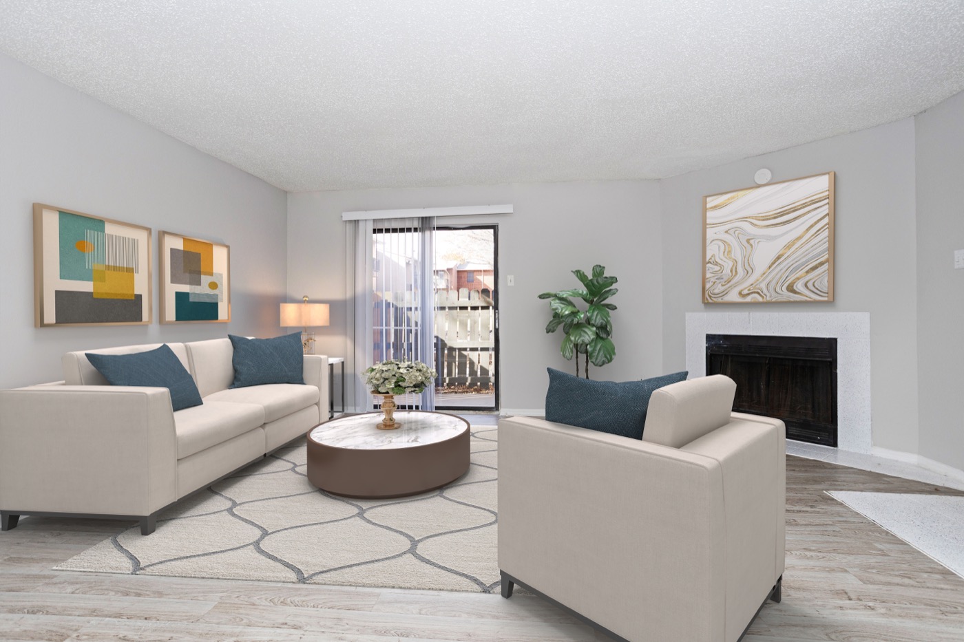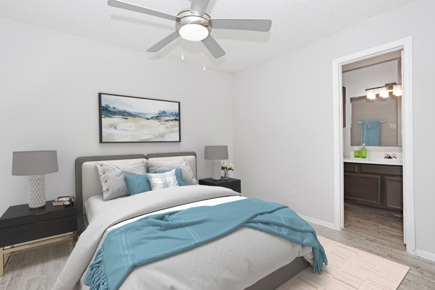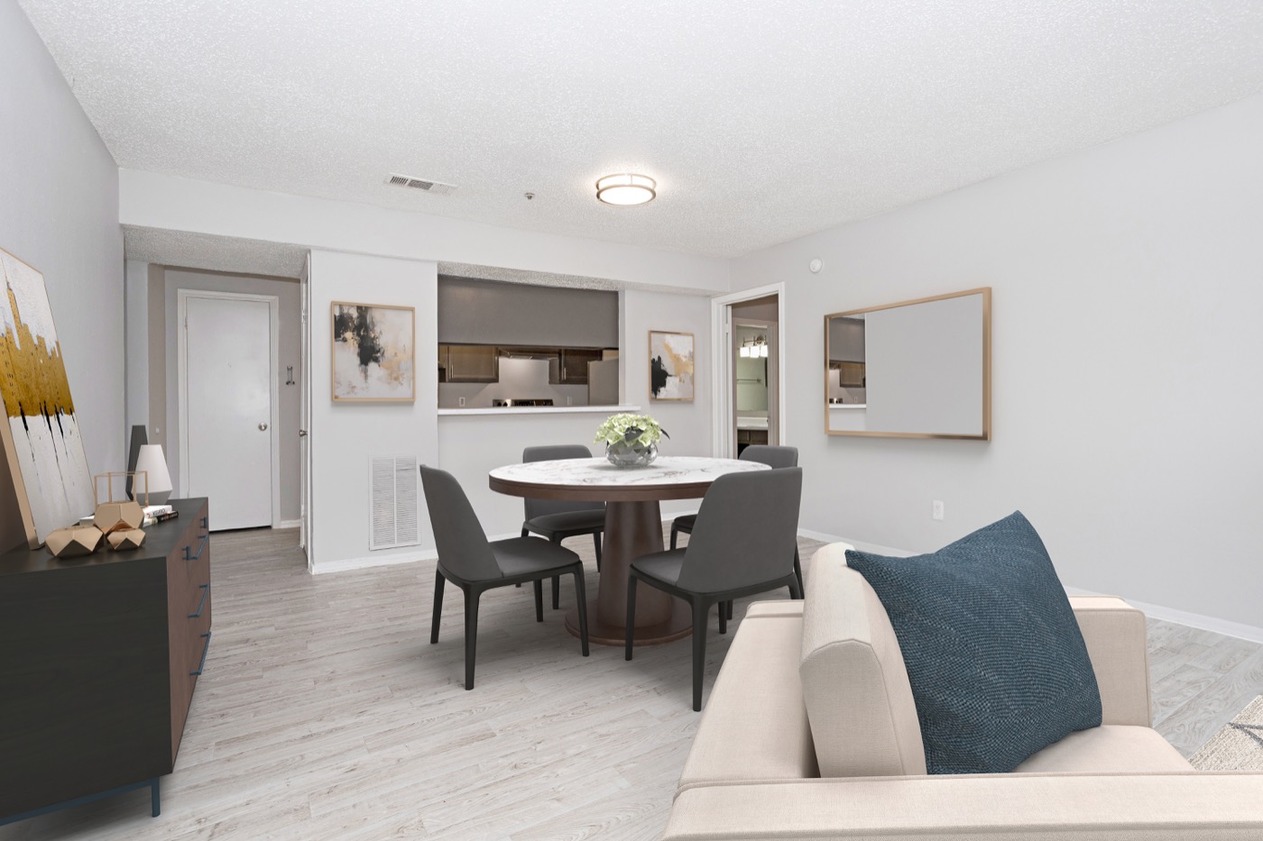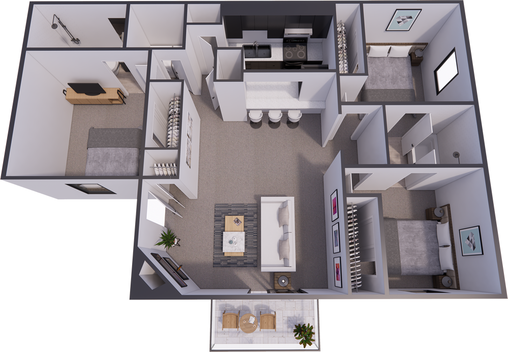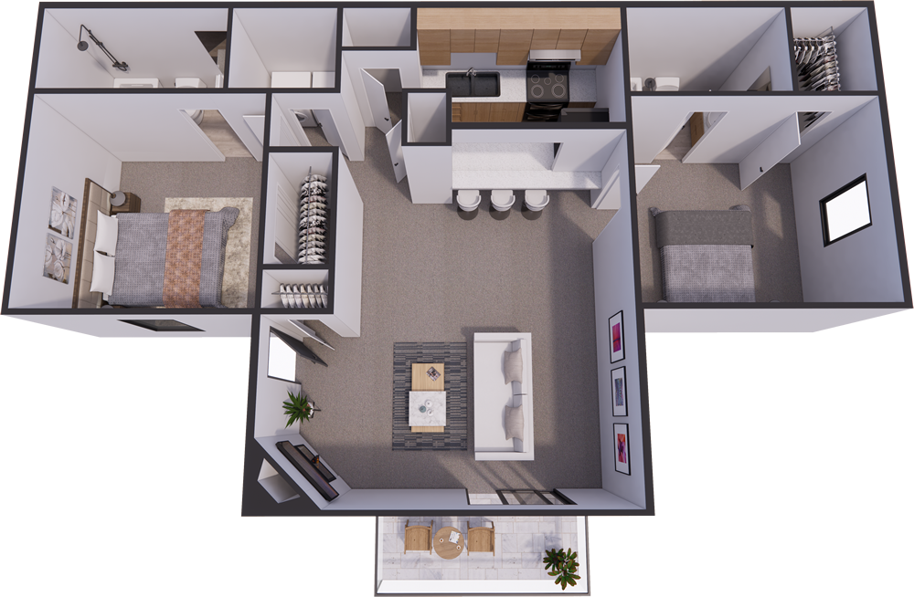 Open two bedroom layout with comfortable gathering spaces.